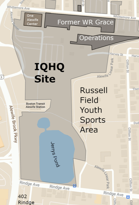 IQHQ purchased the former W.R. Grace and One Alewife properties (just north of Russell Field and the Alewife MBTA headhouse) in 2020. IQHQ is redeveloping these properties into life sciences office and lab buildings. IQHQ calls this project Alewife Park.